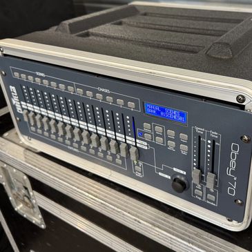 Offers 14 reversible faders, built-in chase effects, and the ability to control up to 12 fixtures with 32 channels each. It also features MIDI compatibility, a built-in joystick for pan and tilt control, and fog/hazer triggering for complete show control.